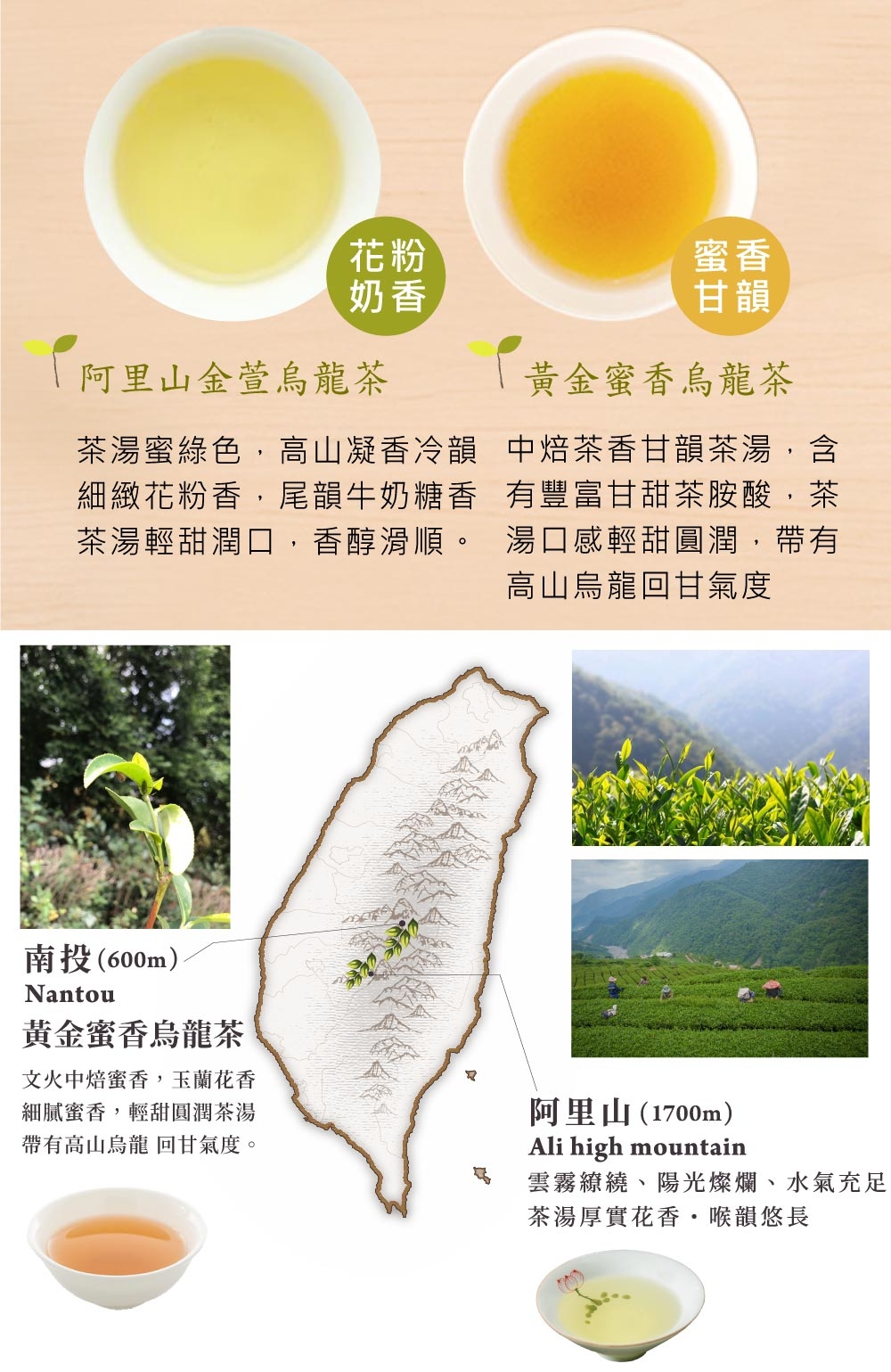 產地:杉林溪 高冷烏龍茶150g.阿里山 金萱茶150g.陳韻 鹿谷凍頂老烏龍茶150g .南投 黃金蜜香烏龍茶150g