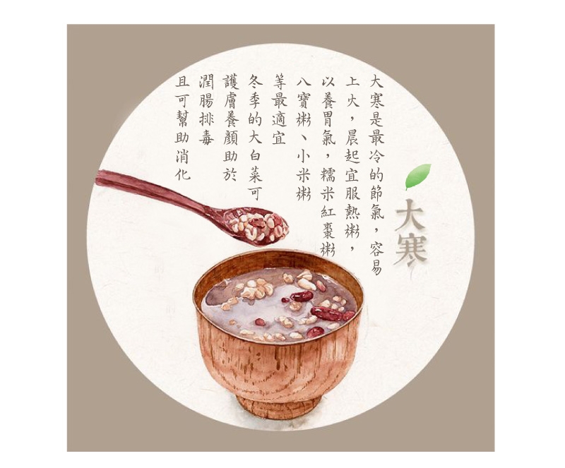 大寒是最冷的節氣,容易上火,晨起宜服熱粥,以養胃氣,糯米紅棗粥、八寶粥、小米粥等最適宜,