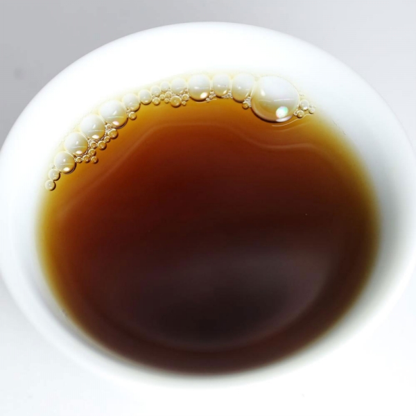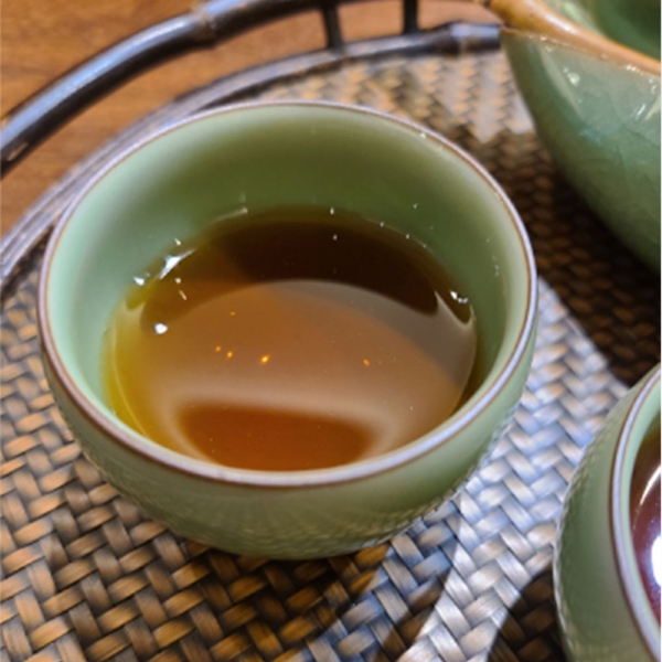 該茶外觀餅形端正,條索肥壯,撒面均勻,熟茶香中夾雜著濃濃的勐海味。沖泡後,湯色褐紅明亮,滋味醇厚,甜香明顯。肥厚的茶底,質厚,水滑甜,帶有木香,蔘香、藥香味明顯,茶香久久留在口腔中迴盪,滋味無窮。