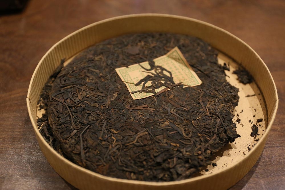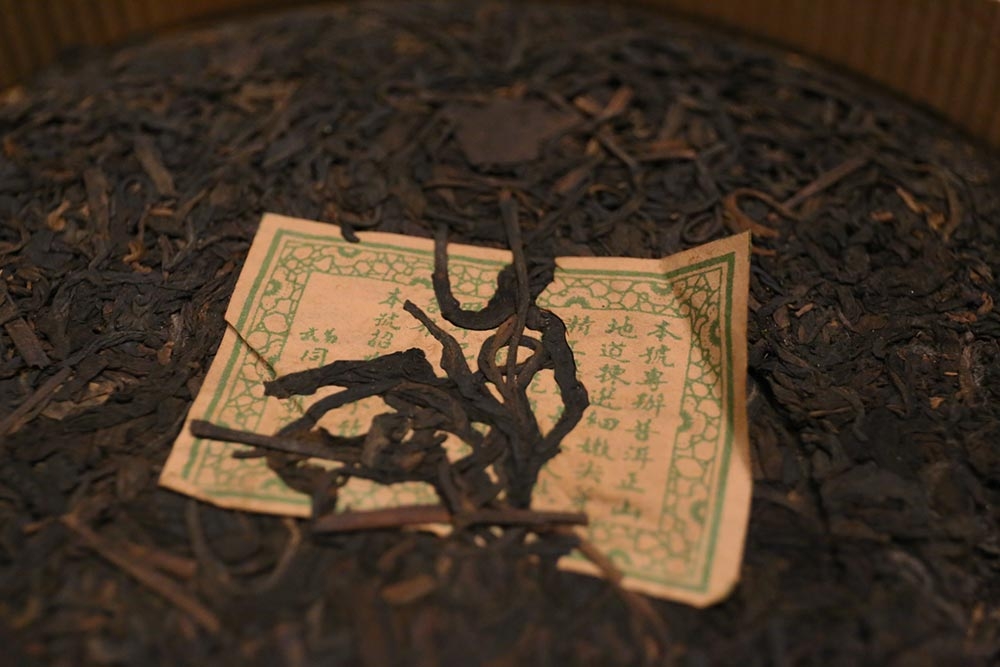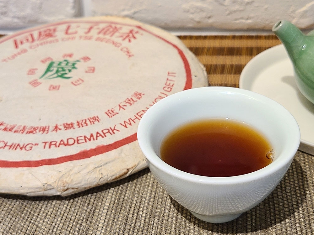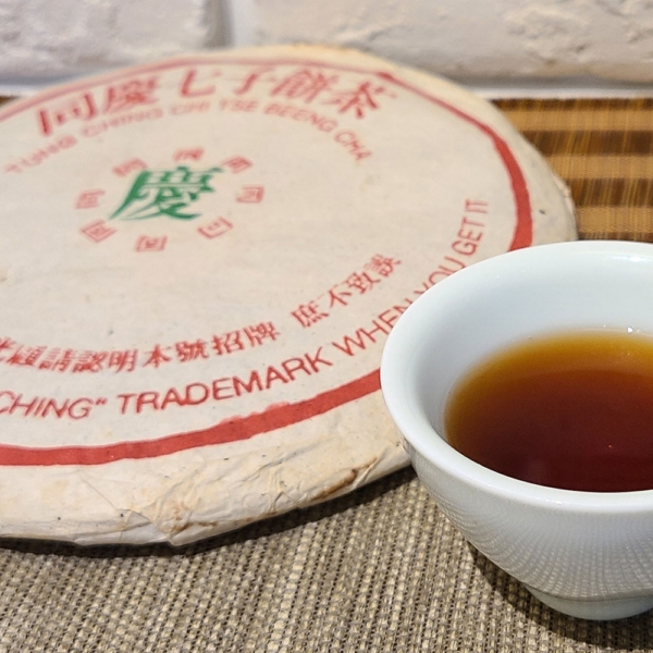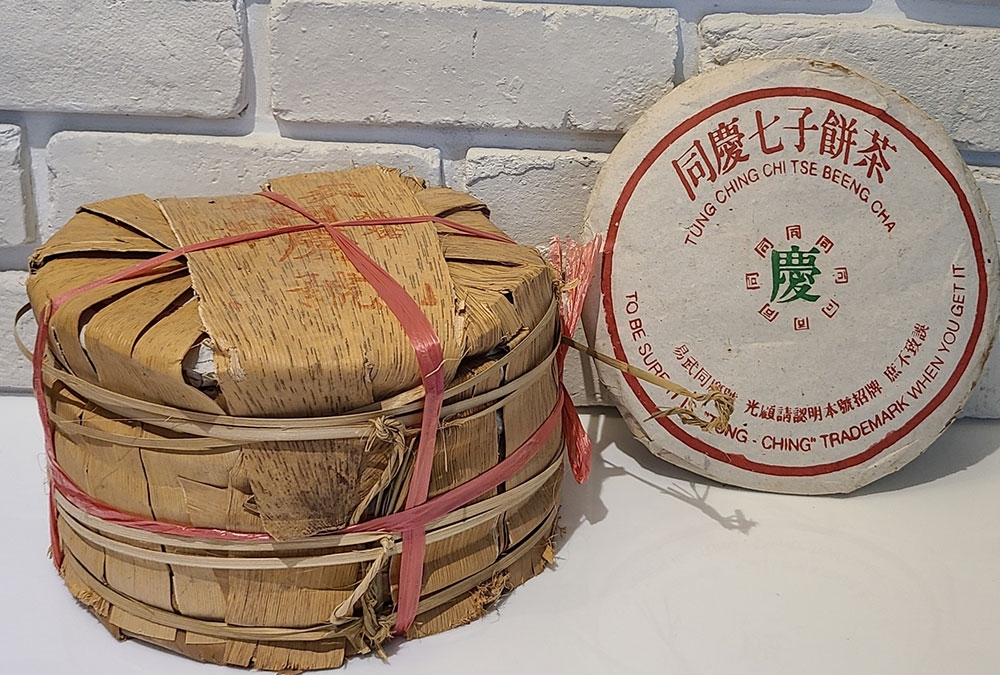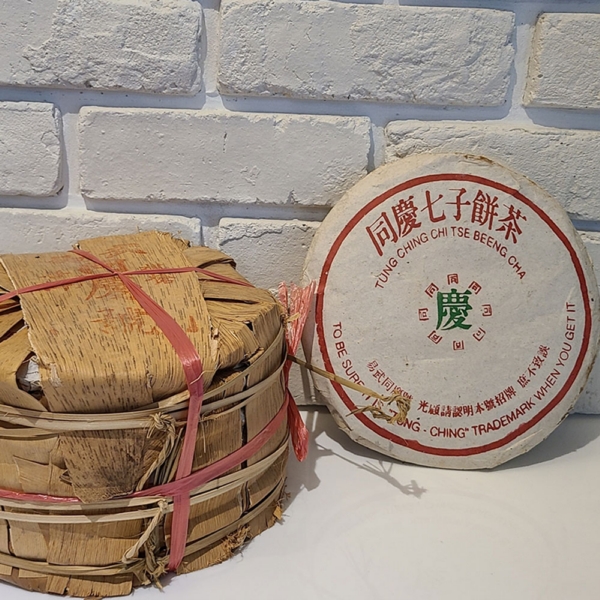 1990年代 前中期時期 同慶號旗槍普洱茶 青餅 原筒竹殼包裝 易武喬木大葉種,一餅重量:400g 30多餘年陳化,台灣自然乾倉,餅面陳化乾淨潤澤 帶有野生樟香,湯色清透琥珀色,表面泛有植物芳香脂,久久不散,藥香韻醇厚,茶氣溫和,回甘回甜俱佳持久。