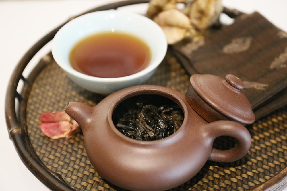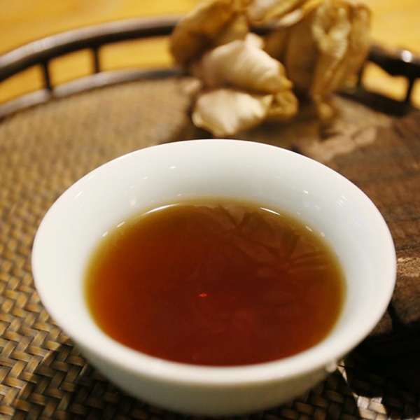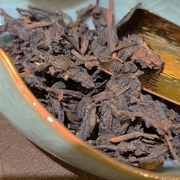 茶湯呈深琥珀色,湯色透亮帶油光,表面泛有植物芳香脂,這是已逾30年以上老茶會有的呈現。